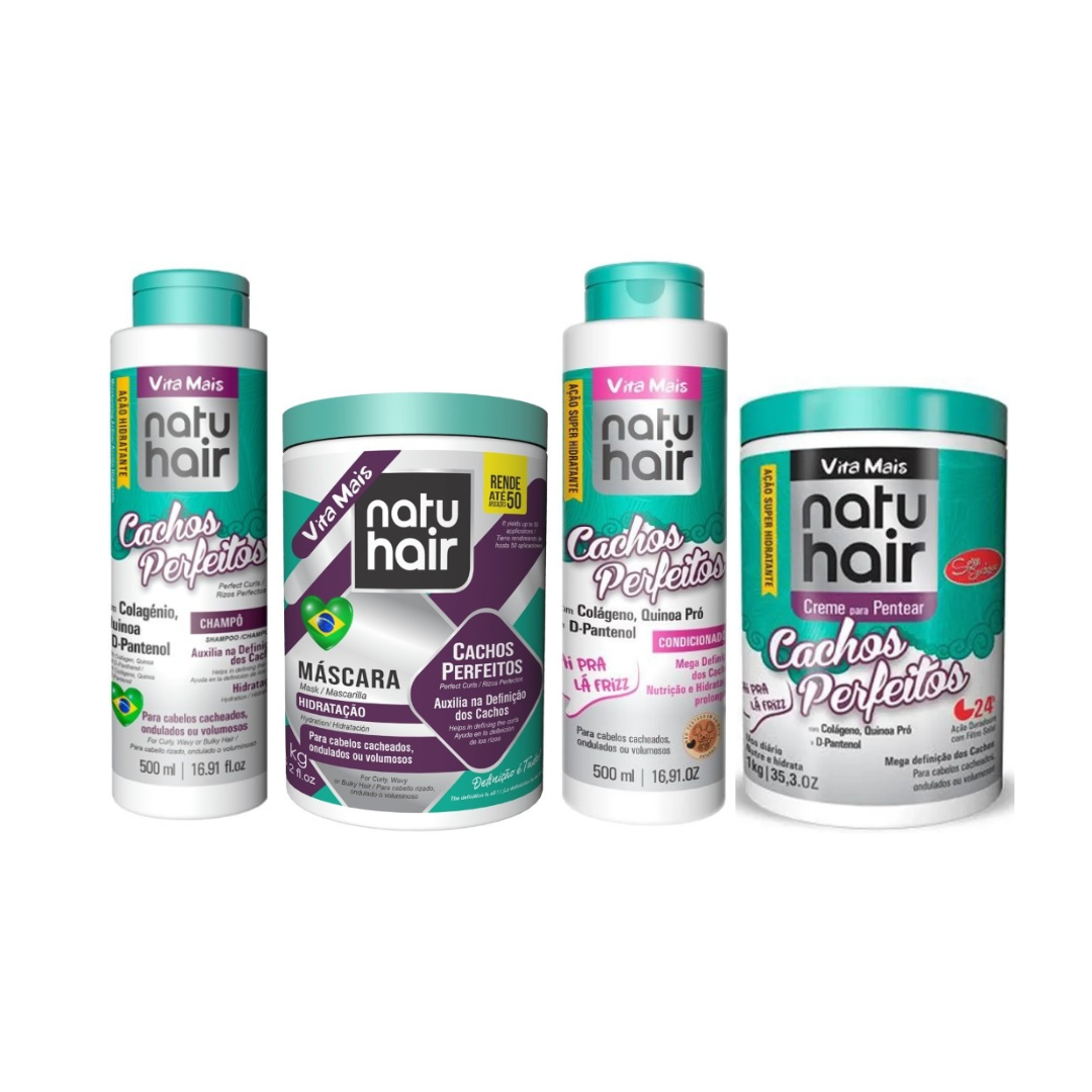 Il Kit Natu Hair Cachos Perfeitos Vita Mais è un trattamento completo pensato per capelli ricci, mossi e ondulati che necessitano di idratazione, definizione e controllo del crespo. La sua formula agisce sulla fibra capillare donando elasticità, morbidezza e ricci più definiti e disciplinati. Grazie alla combinazione di attivi idratanti e rinforzanti, il trattamento aiuta a migliorare la struttura del capello, ridurre il frizz e valorizzare la forma naturale dei ricci, lasciandoli leggeri, luminosi e ben modellati.